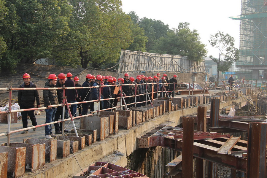 上午,觀摩團一行首先來到了弘陽項目施工現(xiàn)場進行觀摩,聽取了南京公司周月波副經(jīng)理關于弘陽項目概況的簡要介紹,隨后全體人員分成三組,在項目現(xiàn)場管理人員的帶領下深入施工場地進行了細致地學習與了解,重點觀摩了單體地上建筑面積達6萬平方的1號樓,觀看了1號樓西側一層頂板懸挑長度達到5.6m的懸挑梁、6-13層錯層位置內(nèi)側搭設的高度達到了31.2m高支模滿堂腳手架、7層輕質(zhì)隔墻ALC板內(nèi)隔墻安裝施工樣板、采用了SMW工法樁深基坑支護體系和型鋼混凝土支撐體系等重難點部位及制作精致的施工樣板區(qū)。