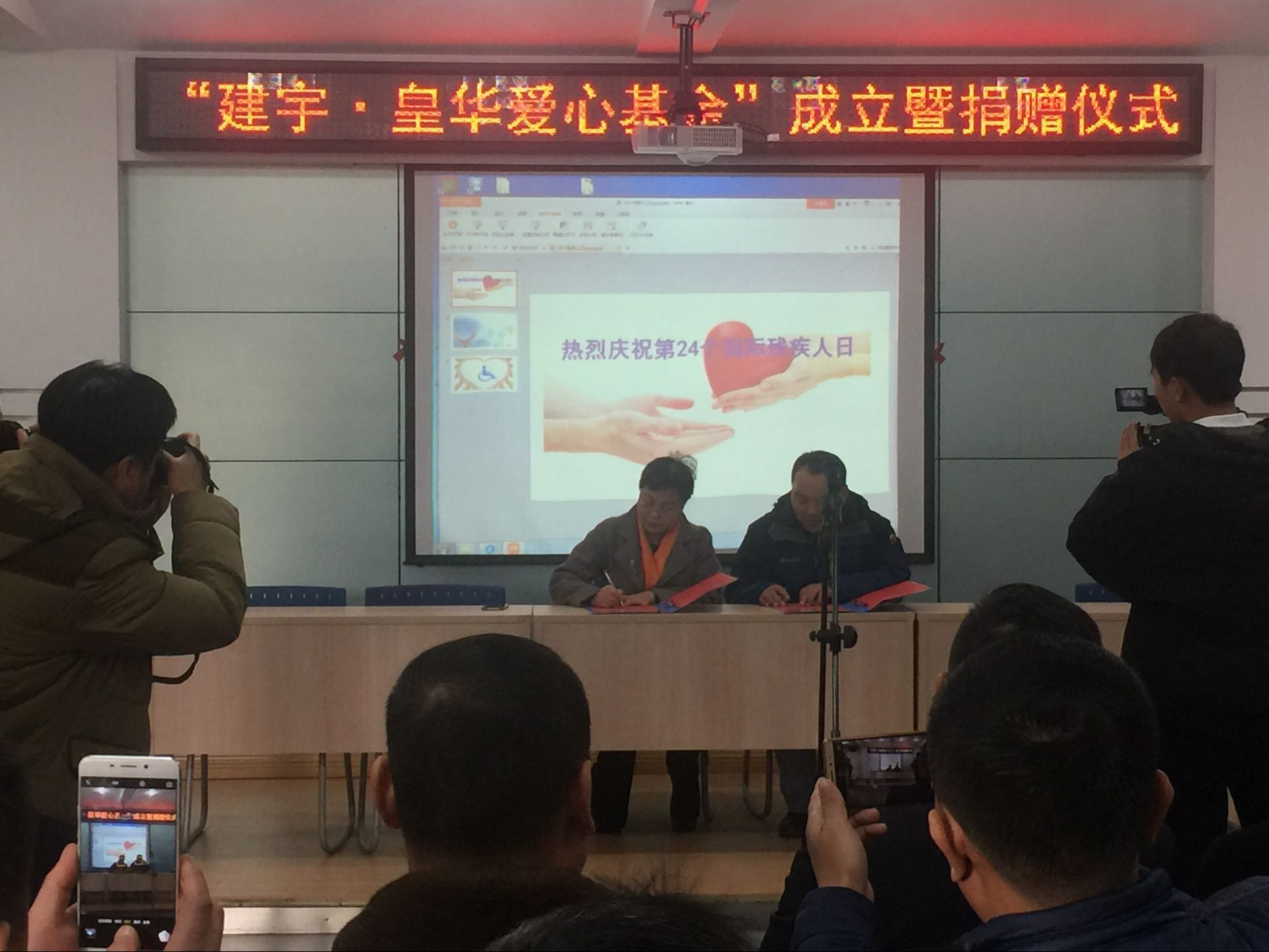 荷花塘特校劉春林校長致歡迎詞,對建宇?皇華愛心基金的捐贈(zèng)表達(dá)了謝意和敬意,并表示按捐贈(zèng)協(xié)議規(guī)范用好善款,發(fā)揮其最大功效。市教育局邵局長高度評價(jià)了建宇集團(tuán)的此項(xiàng)善舉,對一直支持教育事業(yè)、熱衷公益的管民良董事長表示感謝,盛贊集團(tuán)是高郵的重要企業(yè),是一個(gè)社會(huì)責(zé)任感很強(qiáng)的企業(yè),多年來得到了社會(huì)各界的好評。隨后董事長管民良代表集團(tuán)捐贈(zèng),皇華國際大酒店王衛(wèi)紅董事長代表集團(tuán)簽約,殘聯(lián)吉平副理事長為建宇集團(tuán)及管民良董事長頒發(fā)“愛心單位”牌匾和“愛心使者”證書,特校學(xué)生還表演了精心準(zhǔn)備的文藝節(jié)目。