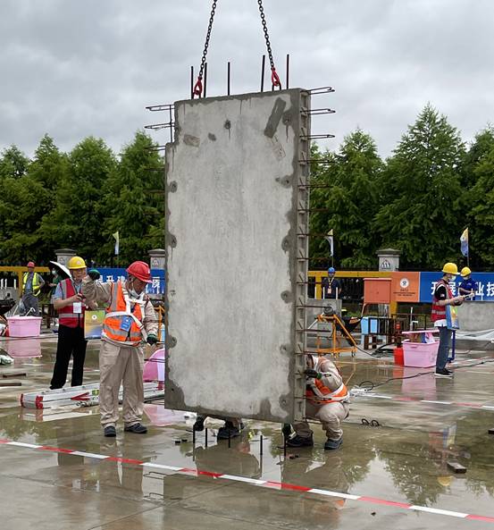 我司代表隊(duì)參加了構(gòu)件裝配組決賽,分為理論和實(shí)操??己藘?nèi)容為預(yù)制剪力墻安裝,過(guò)程中對(duì)操作安全、構(gòu)件入場(chǎng)檢查、檢查預(yù)留筋位置、吊裝準(zhǔn)備、吊裝、構(gòu)件安裝質(zhì)量、團(tuán)隊(duì)合作等7個(gè)方面進(jìn)行考核打分。