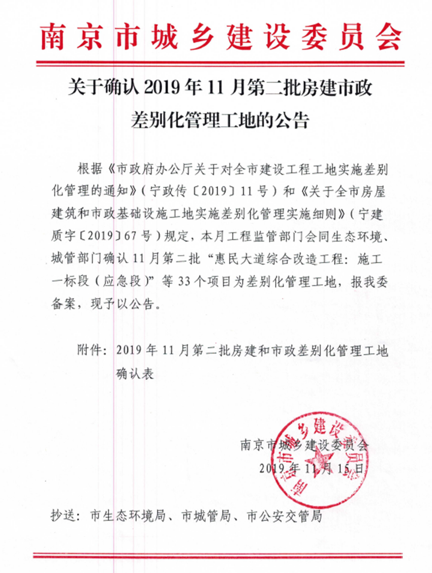 11月15日,從南京市城鄉(xiāng)建設(shè)委員會(huì)傳來喜訊,集團(tuán)南京分公司承建的江蘇智慧城市地下空間產(chǎn)業(yè)園項(xiàng)目,順利通過南京市江北新區(qū)工地差別化管理聯(lián)合檢查驗(yàn)收,獲批南京市建設(shè)工程差別化管理工地,該項(xiàng)目是集團(tuán)公司在南京市場(chǎng)第一個(gè)差別化項(xiàng)目工地。