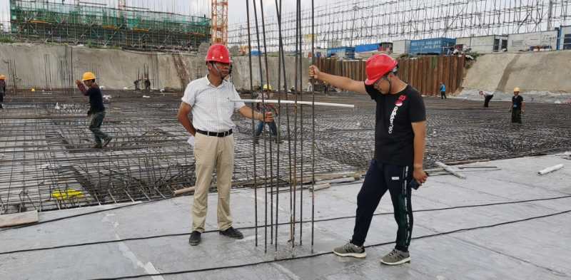 勞務(wù)經(jīng)理吳正祥在后挖土不利的情況下每天頂著高溫酷暑奔波在工地上的每個(gè)角落,不到幾日便曬黑了一圈。