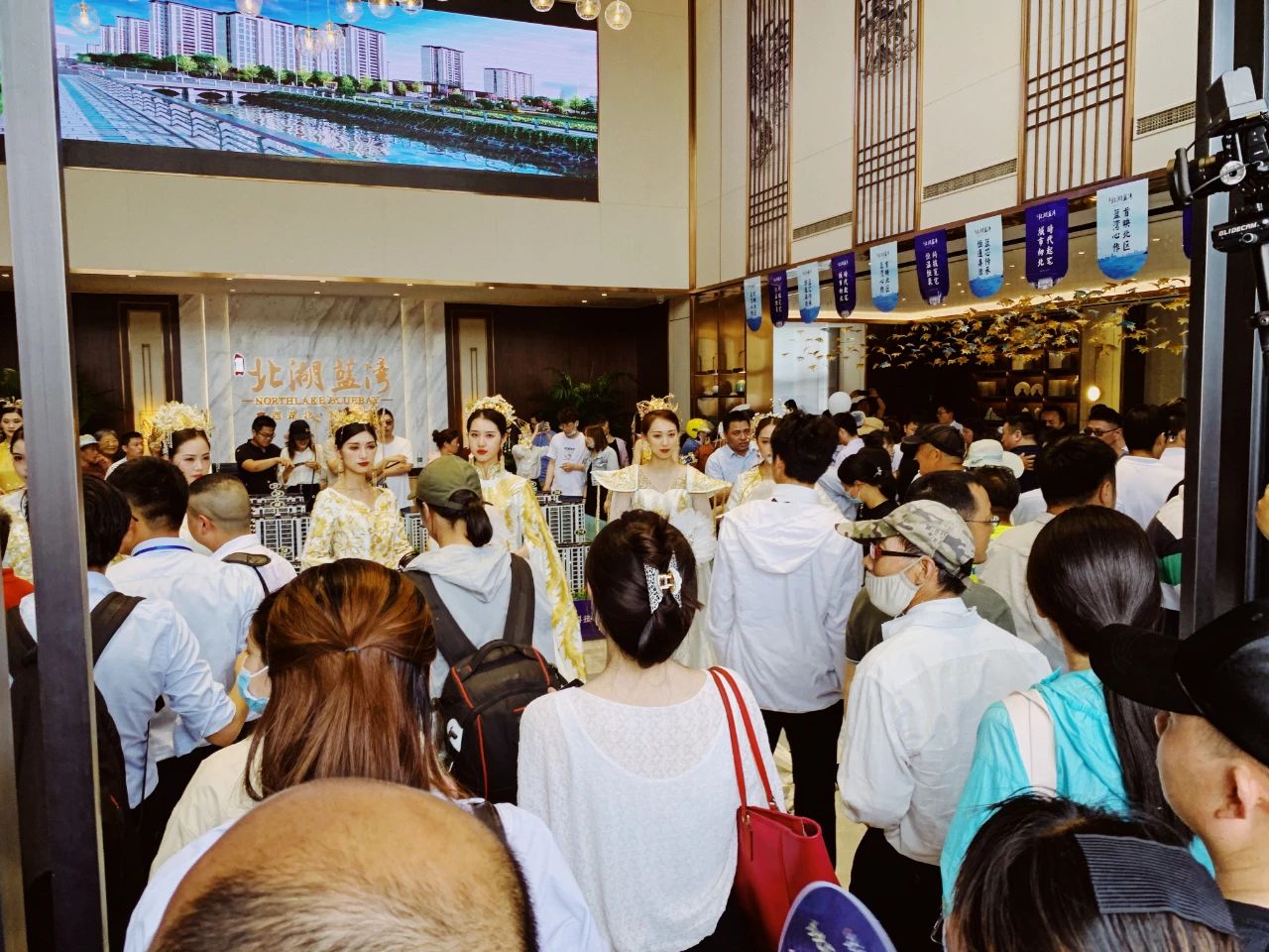 盡管當天的最高氣溫有36℃,但現(xiàn)場氛圍火爆異常,北湖藍灣的營銷中心內(nèi)外擠滿了前來看房的市民,公開儀式開始,董事長管民良攜手恒通集團董事長陳有川等領(lǐng)導共同為營銷中心啟幕,隨著營銷中心大門徐徐打開,迫不及待的買房人如同潮水般涌入銷售大廳。